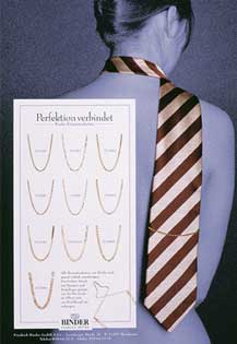 Affäre Was machen Sie als Kreativer, wenn Sie Krawattennadeln ver- kaufen sollen und der Juniorchef des Hauses kalt lächelnd als Eyecatcher eine nackte Schönheit wünscht ? Modell buchen, entblättern, Krawatte umhängen und von der Rückseite ablichten. Nach dem Motto: Auch ein schöner In diesem Fall dürfte der Rücken passender sein. Wir haben uns so jedenfalls aus der Affäre gezogen ohne unseren brainstormenden Auftraggeber enttäuschen zu müssen und Kollegen noch in die Augen schauen zu können. |